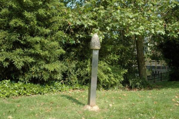 Work composed of two pieces, one of them made of steel and stone, both cold materials but with different industrial significance. The scene is located on the edge of the railing that follows the course of the river, highlighting and contrasting its horizontality with the verticality of the sculpture's two height levels. A piece made of a metallic parallelepiped supported and crowned by stone shapes, a phallic symbol, a floral shape and even a synthesized anthropomorphic character. At ground level, as if it were sprouting from the grass, the second component made only in stone, points to a shape similar to a crown but in another temporary and formal state; kind of semi-open bud.