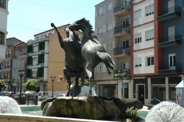 En el centro de una fuente de base triangular redondeada, en los vértices, sobre una roca que echa agua, se sitúa una pareja de caballos rampantes. El autor acostumbra a darle a sus esculturas un apoyo mínimo con el fin de que parezca que se despegan del suelo. Con ese objeto, ayudados de una anatomía exagerada, cada una de estas bestias se sostiene, solamente, en una de sus patas traseras, a pesar de que uno de ellos también precisa afirmar la cola en la roca. Uno de los equinos alza totalmente su cuerpo, curvando cuello y cabeza hacia atrás, en una trayectoria que tienta a la verticalidad. Su compañero le posa en el lomo una pata delantera y, a pesar de que el título y las posturas nos dicen que estamos ante una lucha, desde alguno de los puntos de vista de esta escultura, parece que se tratase de una danza. Estos animales salvajes agitan sus cuerpos en una exhibición de fuerza y enfrentamiento, en la misma línea de la obra que había hecho para la Plaza de España en Vigo. El escultor, fascinado por el mundo de los caballos que monta, cría y admira desde joven, llega a convertir esta pasión en el eje temático principal de su obra. Esta fuente, emplazada en una encrucijada de la villa, recalca el fuerte vínculo que une, a través de la historia, los caballos con las tierras de Lalín. La “Feria del Viento” que se celebraba en la comarca cada mes de abril, o la existencia de la “Irmandad de los Caballeros de Deza” son testimonios palpables de este vínculo.